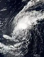 On August 1, a tropical emerged offshore Guatemala.[76] A low-pressure area developed a couple days later, as it passed southwest of Mexico.[77] After further organization, the disterbance developed into a tropical depression around 12:00 UTC on August 5. Moving northwestward toward the southern tip of the Baja California peninsula under favorable conditions, the system began to rapidly intensify, becoming Tropical Storm Eugene six hours later, and attaining peak sustained winds of 70 mph (110 km/h) at 12:00 UTC on August 6.[76] What appeared on satellite imagery to be a possible eye feature was observed at the center of the storm, but soon deteriorated.[78] Later, Eugene moved over cold water west of the Baja California peninsula where its diminishing thunderstorm activity ceased, and it transitioned into a post-tropical cyclone on the afternoon of August 7.[79] The system never directly affect any land areas,[76] though its remnants carried isolated rain showers to the San Francisco Bay Area a few days later.[80]