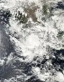 On August 23, a trough of low pressure formed far to the south of the Baja California peninsula.[116] Early on August 27, the disturbance organized, becoming Tropical Depression Ten-E.[117] Amid marginally favorable conditions, the system was able to strengthen, becoming Tropical Storm Irwin twelve hours later.[118] Irwin remained a poorly organized storm, struggling to generate sustained convection in account of increasingly cooler water temperatures and low relative humidity.[119] Consequently, it degenerated to a post-tropical cyclone on August 29.[120]