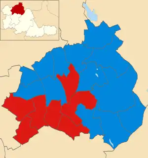 Since its creation in 1974, Walsall has varied between the Conservatives and Labour. Between 1973 and 2004, Walsall had been under Labour control from 1973 to 1976, 1980 to 1982, 1988 to 1992, 1995 to 1996, and 1999 to 2000.[3] It was then under Conservative control between 2004 and 2011, before reverting to no overall control and being retaken by the Conservatives in 2019.[4] In the 2022 elections, the Conservatives gained 1 seat with 43.8% of the vote, Labour lost 1 with 45.2%, and the Liberal Democrats received 5.4%.