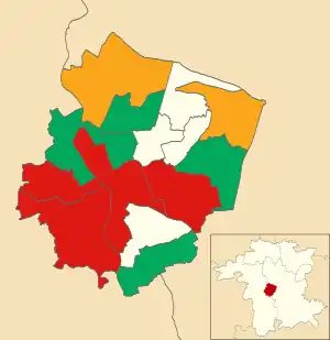Prior to the election the council had been under no overall control. The Conservatives were the largest party and their group leader, Chris Mitchell, was the leader of the council. The council remained under no overall control after the election, but the Conservatives went from being the largest party to being the third largest party, not winning any of the seats available at this election. Conservative leader Chris Mitchell was one of those who lost his seat. Labour were the largest party after the election, for the first time since 2000, and the Greens made the most gains, gaining four new seats and winning the popular vote for the first time.[3]
