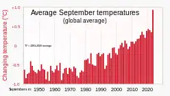 The world breached the Paris Agreement 1.5 °C warming mark for a record number of days.[15] From January to September, the global mean temperature was 1.40 °C higher than the pre-industrial average (1850–1900).[16] January 2023 was the seventh warmest on record – 0.25 °C warmer than the normal but 0.33 °C cooler than January 2020.[17] In July, the global average temperature was 17.32 °C (63.17 °F).[18]