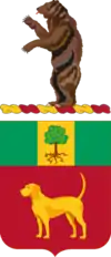 • Shield: Gules, a houn’ dawg statant Or, on a chief Vert a pale of the second (Or) charged with an oak tree eradicated Proper.
