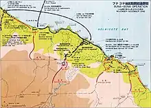At Rabaul, the brigade came under operational control of the 8th Area Army and it was subsequently tasked with reinforcing Japanese troops in the Buna–Gona area, in New Guinea. After leaving their horses in Rabaul,[8] the movement was undertaken aboard several destroyers, and was carried out over the course of several trips in late November and early December, which were severely disrupted by Allied air attack. Some elements of the brigade were lost during the reinforcement movement including the barge carrying the 170th Infantry Regiment's commander and its regimental flag.[10] Consequently, the brigade's troops were scattered over several areas (the Mambare River, the Kumusi, Giruwa), before concentrating around Napapo, to the west of Gona.[11][12]