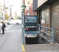 The 23rd Street station is a local station on the IRT Broadway–Seventh Avenue Line of the New York City Subway. Located at 23rd Street and Seventh Avenue in Chelsea, Manhattan, it is served by the 1 train at all times and by the 2 train during late nights. The station was built by the Interborough Rapid Transit Company (IRT) as part of the Dual Contracts with New York City, and opened on July 1, 1918. The station had its platforms extended in the 1960s, and was renovated in the 1990s.