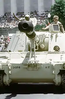 Operation Desert Storm began with an extensive aerial bombing campaign on 17 January 1991. When the ground attack commenced on 24 February, the 24th Infantry Division formed the east flank of the corps with the 3rd Armored Cavalry Regiment.[93] It blocked the Euphrates River valley to cut off Iraqi forces in Kuwait and little resistance.[94] At this time, the 24th Division's ranks swelled to over 25,000 troops in 34 battalions, commanding 94 helicopters, 241 M1 Abrams tanks, 221 M2 Bradley Armored fighting vehicles, and over 7,800 other vehicles.[95] The 24th Infantry Division performed exceptionally well in the theater; it had been training in desert warfare for several years before the conflict.[95] On 26 February, the 24th Division advanced through the valley and captured Iraqi airfields at the Battle for Jalibah Airfield and Tallil. At the airfields, it encountered entrenched resistance from the Iraqi 37th and 49th Infantry Divisions, as well as the 6th Nebuchadnezzar Mechanized Division of the Iraqi Republican Guard. Despite some of the most fierce resistance of the war, the 24th Infantry Division destroyed the Iraqi formations[96] and captured the two airfields the next day. The 24th then moved east with VII Corps and engaged several Iraqi Republican Guard divisions.[97] The 24th Infantry Division's Task Force Tusker attacked entrenched Iraqi forces on 26 February 1991 to seize battle position 143, effectively severing the Iraqi Euphrates River Valley line of communication to the Kuwait Theater of operation and destroying the major combat elements of the Iraqi Republican Guard Forces Command's elite 26th Commando Brigade.[98]