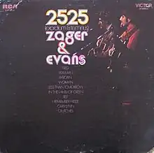2525 (Exordium & Terminus) is the debut studio album by Zager and Evans and was released in 1969. It reached #30 on the Billboard Top LPs chart.[2] The album featured the single "In the Year 2525 (Exordium & Terminus)" which reached #1 on the Billboard Hot 100, on the adult contemporary chart, on the UK Singles Chart,[3] and on the Canadian Pop and AC charts.
