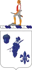 - Shield: Blue and white are colors traditionally associated with Infantry. The grapes refer to service in the Rhineland; the acorn is for the forests of Ardennes; and the fleur-de-lis for Central Europe; all symbolic of the unit's service in World War II.