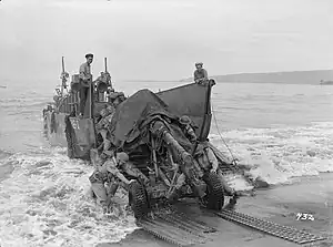 ![]() A Bofors gun of 29th Light Anti-Aircraft Regiment being unloaded from a landing craft | |