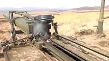 The 2S4 Tyulpan design shares the same chassis as the 2S3 Akatsiya and carries an externally mounted 240 mm 2B8 mortar on the rear of the hull. The 2S4 has a capacity of 40 standard high-explosive rounds or 20 long-range rocket-assisted rounds.[10] These are placed in two automated drum-type magazines. The rounds are fed to the top of the carrier, where they are placed on a track. The mortar then tilts to the horizontal position. The breech opens, and a ramming device pushes the round into the breech. The breech closes, and the mortar tilts into the firing position. In combat, the mortar is elevated between 50° and 80°, and it can fire one round per minute.[11]