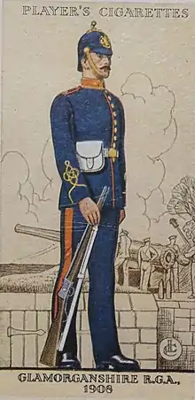 The new unit formed part of the Western Division of the Royal Artillery (RA). In 1899 the artillery volunteers became part of the Royal Garrison Artillery (RGA) and when the divisional structure was abolished the Cardiff unit was designated the 2nd Glamorganshire RGA (Volunteers) on 1 January 1902.[4][9][10]