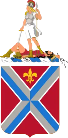 Approved on 31 March 1925, the Distinctive Unit Insignia is a Gold color metal and enamel device 13⁄16 inch (2.1 cm) in height overall consisting of a shield blazoned: Gules, a saltire Argent voided throughout per saltire Gray and Azure per cross counterchanged, in chief a fleur-de-lis Or. Attached below and to the sides of the shield a Gold bipartite scroll inscribed "EVER" to dexter and "FORWARD" to sinister in Black letters. The blue and gray on the insignia represents the mixed Confederate and Union lineage of the regiment and its artillery traditions. The fleur-de-lis symbolizes the regiment's service in France in World War I.[85]