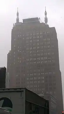 Upon buying 32 Avenue of the Americas, the Rudins planned to renovate the building into a "New York Global Connectivity Center".[22] By the September 11, 2001, attacks, the building was 75% occupied.[58] Between 2001 and 2002, 32 Avenue of the Americas underwent an extensive renovation by the architecture firm of Fox & Fowle, which included the installation of new mechanical and communications infrastructure. Numerous features of the building's original design were restored, including the lobby. A quarter of the building's windows were replaced with louvers which emulated the pattern of the original sash windows. Two 120-foot-tall (37 m) communications masts were installed, increasing the building's height from 429 feet (131 m) to 549 feet (167 m).[22][59] The LPC approved the telecommunications masts, stating that changes would be inevitable due to technological advances, although the commission said these changes would need to respect the building's existing architecture.[22]