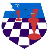 - ↑ Approved 6 August 1957. Description: On a shield of a chessboard in perspective, medium blue and white, a chief of light blue sky, over all in sinister, a chess knight wearing jet helmet with winged plume and white goggles, details black, and in dexter, a castle (or rook) and a true chess knight, all red; in chief a white cloud issuing from the dexter, three fissionable flowers, orbits black, nuclei red, electrons white, and three white futuristic bombers in formation, outlines and details black throughout.