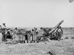 39th Siege Bty was equipped with four 8-inch howitzers.[6] At this stage of the war the 8-inch howitzers in use (Marks I–V) were improvised from cut-down and bored-out barrels of 6-inch coast defence guns, with the recoil checked by enormous wooden wedges.[8][9] The battery unloaded its guns at Boulogne on 5 November and between 13 and 15 November it emplaced them at Elverdinge, north of Ypres. On 19 November it began registering its guns on local targets with the help of air observation whenever the weather was clear enough. Some of these shoots brought down retaliatory fire from the Germans. Communications with the battery's own Forward Observation Officers (FOOs) in the front line were frequently cut by shellfire. From December the battery began short bombardments of requested targets, while continuing its registration. Regular targets included 'Von Spree Farm' and 'Essen Farm'. Requests came for bombardments of troublesome machine gun and mortar positions, SOS calls from frontline infantry subjected to trench raids, and for retaliatory shelling of gun positions. This routine continued through the early months of 1916, with the battery suffering a steady trickle of casualties. In late March the battery struggled to move a howitzer from its Left Section (LX) to a better position with the help of a Caterpillar tractor; the other followed two weeks later, as a result of which the sections temporarily became North and South (NX and SX) instead of the usual Left and Right (LX and RX).[10]