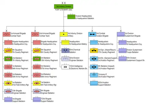 The 3rd Infantry Division (3ID) (nicknamed Rock of the Marne)[1][3] is a combined arms division of the United States Army based at Fort Stewart, Georgia. It is a subordinate unit of the XVIII Airborne Corps under U.S. Army Forces Command. Its current organization includes a division headquarters and headquarters battalion, two armored brigade combat teams, one aviation brigade, a division artillery, a sustainment brigade and a combat sustainment support battalion along with a maneuver enhancement brigade. The division has a distinguished history, having seen active service in World War I, World War II, the Korean War, and the Global War on Terror. The Medal of Honor has been awarded to 61 members of the 3rd Infantry Division, making the division the most honored in the Army.[4]