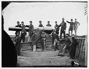 In the spring of 1864, the 3rd Unattached Company, along with the 6th through 12th, were ordered to Washington, DC, where they were to garrison the forts protecting the capital. In June of 1864, the 6th, 7th, 8th, 9th, 10th, 11th, 12th, and 14th independent companies were part of the 3rd brigade, within Joseph A. Haskin's division.[2] At the same time, the 3rd and 15th companies were part of the 2nd brigade within Gustavus De Russy's division.[3]