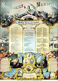 The regiment suffered 13 officers and 168 enlisted men who were killed in action or mortally wounded and 5 officers and 201 enlisted men who died of disease, for a total of 387 fatalities.[2] The regiment also suffered 473 wounded. Percentage wise, the regiment lost 11.1% to enemy action and 12.7% to other causes, or a total of 23.8% fatalities, and a total casualty percentage of 40.3%.[3]