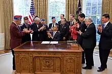 The 442nd Regiment is the most decorated unit in U.S. military history.[7] Created as the 442nd Regimental Combat Team (Japanese: 第442連隊戦闘団,[8][9] [10][11] Dai Yonhyakuyonjūni Rentai Sentōdan) when it was activated 1 February 1943, the unit quickly grew to its fighting complement of about 4,000 men by April 1943, and an eventual total of about 10,000 men[12] served in the combined 100th Infantry Battalion and 442nd RCT. The combined units[5] earned, in less than two years, more than 4,000[5] Purple Hearts and 4,000 Bronze Star Medals. The unit was awarded seven Presidential Unit Citations (seven between 1944 and 1946,[13] five earned in one month).[14] Twenty-one of its members were awarded the Medal of Honor.[4] In 2010, Congress approved the granting of the Congressional Gold Medal to the 442nd Regimental Combat Team and associated units who served during World War II,[15] and in 2012, all surviving members were made chevaliers of the French Légion d'Honneur for their actions contributing to the liberation of France and their heroic rescue of the Lost Battalion.[16]