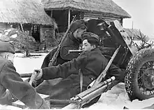 In addition to serving in the Red Army, 53-K guns were also supplied to Republican Spain and were used by the International Brigades in the British Anti-tank Battery of the XV Brigade, who served from the Battle of Brunete onwards. Richard Baxell notes that the gun in Spain "was effective against even heavy tanks at distances of up to three kilometers."[3] The guns also saw service in first stage of the German-Soviet War, but their anti-armor capabilities allowed them to fight successfully only with German light tanks and armored personnel carriers. Early models of the Panzer III and Panzer IV could also be knocked out at close range, but this put Soviet artillerymen in greater danger. Due to these circumstances, model 1937 guns were replaced with an all-new design, the more powerful model 1942. The mass production of outdated model 1937 guns was stopped in 1943. The total number of guns produced was 37,354. The German designation for captured M1937 guns was the 4.5 cm Pak 184/1(r).[4]