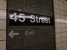 33. Cox, Jeremiah (June 5, 2009). "A 45 Street platform sign, text and an arrow for the only exit to 45 St painted beneath it". subwaynut.com. Retrieved December 18, 2018.