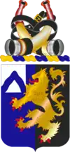 - Shield- The colors blue and white are used for Infantry. Black and gold are the colors of the Belgian coat of arms from which the Belgian lion is adapted. The wavy chevron on the canton is for descent from the 9th Infantry. The Belgian lion represents the organization’s action at Ardennes and St. Vith, for which it was awarded two unit decorations by the Belgian government.