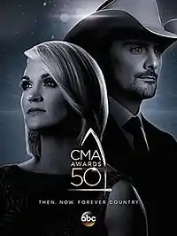 The 50th Annual Country Music Association Awards, commonly known as CMA 50 or the 50th CMA Awards, were held on November 2, 2016 at the Bridgestone Arena in Nashville. The ceremony recognizes some of the best country music released during the eligibility period (between July 1, 2015 and July 20, 2016[1]). It is the eleventh ceremony to be held at the Arena, the seventeenth to be held in November and the ninth night to be co-hosted by country stars Brad Paisley and Carrie Underwood. The ceremony was directed by Paul Miller.