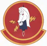 - ↑ Approved 4 October 1943. Description: On a scarlet disc, a white flying Trojan horse, outlined in black, winged with Fortress wings ultramarine blue, edged white, having a golden lance spike on the knees of each foreleg. eyes red, and breathing jagged golden orange lightning flash from each nostril.