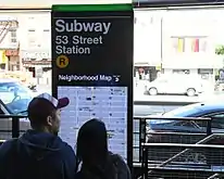 40. Cox, Jeremiah (June 9, 2009). "A 53 Street platform sign, text and a arrow for 52 St is painted beneath this one". subwaynut.com. Archived from the original on March 8, 2016. Retrieved March 26, 2017.