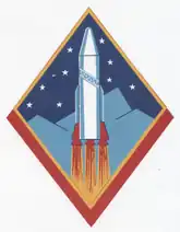 - ↑ Approved 20 October 1958. Description: On an Air Force blue lozenge edged Air Force golden yellow and spattered with white stars, a range of light blue mountains issuing from base; overall palewise a white intercontinental ballistic missile shaded light blue speeding upward, its fins red, three rocket motors Air Force blue emitting trails of flame, red, and Air Force golden yellow; encircling the shaft of the missile the light blue SAC ribbon spattered with white stars; outlines and details Air Force blue throughout.