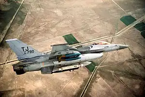 - ↑ The closest aircraft is General Dynamics F-16A Block 15H Fighting Falcon, serial 81-790 carrying Mark 82 bombs on its wing pylons and an AN/ALQ-131 electronic countermeasures pod on the centerline over the Konya Range on 7 May 1986. This plane was sent to the Aerospace Maintenance and Regeneration Center (AMARC) on 26 June 1996. Baugher, Joe (3 March 2023). "1981 USAF Serial Numbers". Joe Baugher. Retrieved 8 May 2023.