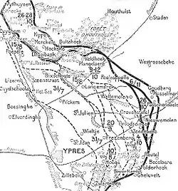 The division arrived at Ypres just before the Second Battle of Passchendaele (26 October – 10 November).[26] On 26 October, Immediately to the north of the Canadian Corps, the supporting attack by XVIII Corps involved one brigade each from the 63rd and 58th divisions. The 188th Brigade, of the 63rd Division quickly captured Varlet Farm and Banff House. The centre of the attack was held up on the road between Bray Farm and the village of Wallemolen and the troops dug-in near Source Trench. As dark fell, Banff House was abandoned and the line reformed at Berks House, leaving Banff House and Source Trench the only part of the first objective not occupied.[27] On 30 October, the 63rd Division infantry were caught by German artillery fire at their jumping-off line and made only slight progress in deep mud against German machine-gun fire. The infantry were unable to reach their rendezvous with the Canadians, leaving their troops at Source Farm and Vapour Farm in precarious positions.[28] Two companies later advanced through the Canadian sector to capture Source Trench but were only able to reinforce the Canadian outpost at Source Farm, then form a defensive flank to Vapour Farm. The 63rd Division had 3,126 casualties from 26–31 October.[29] The division was able to close up to the Paddebeek by attacking at night from 1/2–4/5 November, a method which took more ground than its attacks in October, for a loss of 14 killed and 148 wounded.[30]