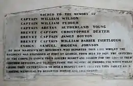 The regiment suffered a number of attacks while garrisoning the citadel, the rest of the force having moved to the more hospitable east of the island. During one attack, the regiment's commanding officer Lieutenant-Colonel Peter Desbrisay was killed.[6] The regiment remained in the West Indies for a further five years.[7]