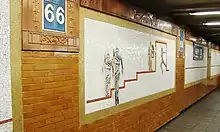 The walls at the platform level contain a mosaic artwork called Artemis, Acrobats, Divas and Dancers, which was designed by local artist Nancy Spero as part of the MTA Arts & Design program.[58][59] The artwork, installed in 2001, consists of 22 panels that depict a diva in various settings, a reference to the station's location next to Lincoln Center.[59]