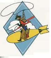 - ↑ Approved 20 July 1943. Description: Over and through a light blue lozenge, piped white, a Wild West cowboy, wearing brown hat, jacket, and chaps, lavender shirt, blue trousers,, black boots, seated on brown saddle with red saddle cloth fastened about the middle of a large yellow aerial bomb, trimmed black, while shooting a revolver with the right hand, and twirling a lariat above the head with the left hand, all in front of a white cloud formation crossed by a red lightning bolt.
