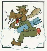 - ↑ Approved 24 July 1943. Description: On a white rectangle, long axis vertical, border black, a caricatured brown wolf in khaki work uniform, astride a large white cloud formation in base, edged light blue, carrying a large knotty club tan with spike through end, in right hand, and carrying a blue aerial bomb under the left forepaw; red polka dot handkerchief in hip pocket.