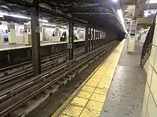 Construction resumed on the extension in November 1946.[6][10] The delay meant the station received different design features than the rest of the stations along the line, including a slightly different tiling, fluorescent lighting instead of then-standard incandescent lights, and improved restroom and phone booth facilities.[5][11][12] The station also featured a then-modern interlocking technology, known as the "NX" system, wherein train operators would press buttons that automatically adjusted the corresponding switches. In older interlockings throughout the subway system, workers in a separate control tower had to manually adjust the switches using a series of levers within the tower.[6][13][14][15]