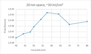 7 nm EUV stochastic failure probability. 7 nm features are expected to approach ~20 nm width. The probability of EUV stochastic failure is measurably high for the commonly applied dose of 30 mJ/cm2.