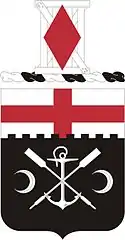 - Shield- Black and white were the old colors of the Engineer Corps. The anchor and oars device was the badge of the Engineers and Pontoniers of the Army of the Potomac where the old units of the regiment did such gallant service. The crescents are the device of General Winfield Scott and represent the service of the old company in 1846–1848 in the Mexican War. In France, the regiment served with great gallantry in the 5th Division. The crossing of the Meuse near Dun is indicated by the device in chief of the shield which is not only a cross for the crossing of the river but the device of the lords of Dun.