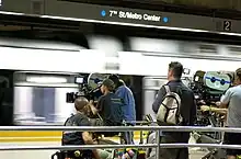 7th Street/Metro Center station is an underground light rail and rapid transit (known locally as a subway) station on the A, B, D, and E lines of the Los Angeles Metro Rail system. The station also has street level stops for the J Line of the Los Angeles Metro Busway system. The station is located under 7th Street, after which the station is named, at its intersections with Figueroa, Flower and Hope Streets.[2]