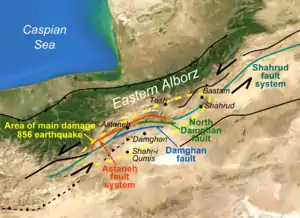 - 1 2 3 4 Hollingsworth, J.; Nazari H.; Ritz J.-F.; Salamati R.; Talebian M; Bahroudi A.; Walker R.T.; Rizza M.; Jackson J. (2010). "Active tectonics of the east Alborz mountains, NE Iran: Rupture of the left‐lateral Astaneh fault system during the great 856 A.D. Qumis earthquake" (PDF). Journal of Geophysical Research. American Geophysical Union. 115 (B12313): B12313. Bibcode:2010JGRB..11512313H. doi:10.1029/2009JB007185. S2CID 30506709. Retrieved 15 October 2011.