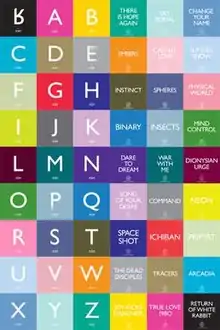 Each single is assigned a specific colour and letter A–Z, prequel track "Return of White Rabbit" features the upside down stylized as ʁ, representing the rabbit. The front of each single simply shows the letter followed by the band's logo below, whilst on the back the track name is shown. The coloured artwork has also been used for the promotion of their A–Z Tour, with each colour representing a place and a letter of the alphabet, similarly the band through their forum Archived 16 December 2009 at the Wayback Machine and the assistance of their webmaster have allowed fans to create their own avatars and use emoticons in the A–Z style.[14] Almost all of the artwork for the series was created by Post 98 Design and Modo Productions, with the exception of the cassette Letters from Alphabet City which was created by Elisa Dalla Tor and handmade "Return of White Rabbit" and "War with Me" CD singles which were created by the band.[15][16]