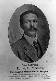 A.C. Jackson was an African American surgeon who was murdered during the Tulsa race massacre in 1921 and is known as the most prominent victim of the massacre. Jackson was a leading member of the Oklahoma medical community and the African-American community in Tulsa, Oklahoma until his death.