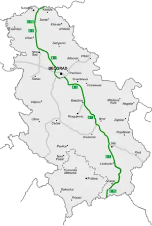The A1 motorway (Serbian: Аутопут А1, romanized: Autoput A1) is a motorway in Serbia and at 588 kilometers (365 mi) it is the longest motorway in Serbia. It crosses the country from north to south, starting at the Horgoš border crossing with Hungary and ending at the Preševo border crossing with North Macedonia. As a part of the European route E75 and Pan-European corridor X, connecting 4 of 5 largest Serbian cities (Belgrade, Novi Sad, Niš and Subotica), it is the most vital part of the Serbian road network.