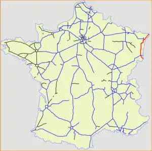 The A35 autoroute is a toll free motorway in northeastern France. It is also known as the Autoroute des cigognes and the Voie Rapide du Piémont des Vosges. It connects the German border in the Rhine valley with the Swiss frontier via Strasbourg. The road forms part of European routes E25 and E60.