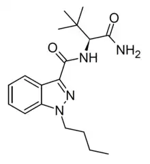 - ↑ Sparkes E, Cairns EA, Kevin RC, Lai F, Grafinger KE, Chen S, et al. (February 2022). "Structure-activity relationships of valine, tert-leucine, and phenylalanine amino acid-derived synthetic cannabinoid receptor agonists related to ADB-BUTINACA, APP-BUTINACA, and ADB-P7AICA". RSC Medicinal Chemistry. 13 (2): 156–174. doi:10.1039/D1MD00242B. PMC 8864554. PMID 35308023. S2CID 239951357.