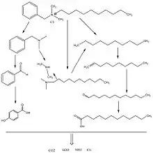 Benzalkonium chloride degradation follows consecutive debenzylation, dealkylation, and demethylation steps producing benzyl chloride, an alkyl dimethyl amine, dimethylamine, a long chain alkane, and ammonia.[52] The intermediates, major, and minor products can then be broken down into CO2, H2O, NH3, and Cl–. The first step to the biodegradation of BAC is the fission or splitting of the alkyl chain from the quaternary nitrogen as shown in the diagram. This is done by abstracting the hydrogen from the alkyl chain by using a hydroxyl radical leading to a carbon centered radical. This results in dimethylbenzylamine as the first intermediate and dodecanal as the major product.[52]