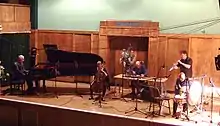 Eventually, the group settled on a line-up of Prévost, Rowe, Gare, bassist Lawrence Sheaff and pianist/cellist Cornelius Cardew, and, in early 1966, were calling themselves AMM.[3] However, some early performances were billed as the "Cornelius Cardew Quintet",[5] a mistake which both irked and amused the musicians. After a few paying performances, Cardew bought two amplifiers so the other instruments could compete with the volume of Rowe's guitar. In addition to amplifying their instruments, Cardew and Gare would apply contact microphones to various common objects to amplify the sounds made by, for example, rubbing a glass jar or striking a coffee tin.