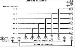 Beams 2 through 9 were projected in horizontal array; 10 through 17 (although 10 actually lies in the horizontal row) were grouped as the vertical component. All beams of each group were powered simultaneously. Except for being controlled by a master timing signal, each of the eight channels operated independently of the others. Each transmitter was on a slightly different frequency to prevent interaction with the others. The transmitted pulse, 2000 microseconds long, was coded, or tagged, by being passed through a tapped delay line which may reversed the phase at 20-microsecond intervals. Upon reception the returned signal was passed through the same tapped delay line and compressed 100:1, to 20 microseconds in order to increase the accuracy and resolution of the range measurement, which was of course a function of the interval between transmission and return.