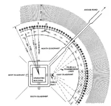 The 1970 estimate to construct a CDAA was just under $900,000 ($6.78 million today) with electronics at the site estimated at $20 million ($151 million today).[1] The system had 120 high band antennas and 40 low band antennas which had to be positioned within +/- two minutes of arc and +/- 3 inches of their intended distance from the center of the array. 160 75 ohm coaxial transmission lines were used to carry signals from the antennas had to be electrically matched to within 3/4 of a degree at 10 MHz. This task was estimated at 300 to 400 man hours to complete.[1] There was also an extensive grounding system used at the FRD-10 sites. This included 360 ground radials made of 8 AWG wire, 150 feet (46 m) long, extending from the outer antenna ring. It also included a massive ground grid, made of 10 AWG wire bonded together to create a mesh with 2 feet (61 cm) squares. It was laid underground up to the radials in the area between the high and low antennas.[1]