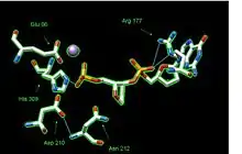 Hydrogen bonding among key amino acid residues help stabilize active site structure. Moreover, a negatively charged residue (Glu 96) helps hold the Mg2+ also needed to stabilize the AP site in place PDB 1de9.[1]